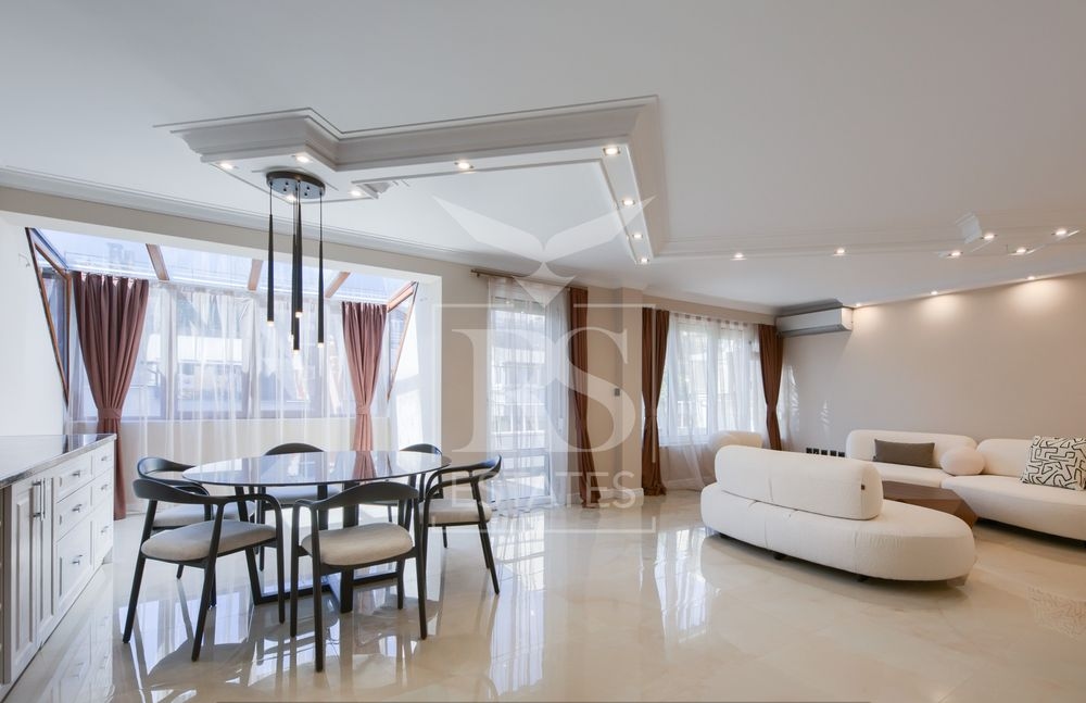 В жилището е изпълнен цялостен ремонт, с подмяна на настилки - камък, гранитогрес, мраморни стълби, естествен паркет, цялостна щпакловка и латекс по стени и тавани, най-висок клас входна блиндирана врата с видео домофонна уредба, СОТ система, нови осветителни тела, цялостна подмяна на ЕЛ и ВИК инсталации, окабеяляване за интернет, поръчкова кухня с масивен плот, чисто нови уреди на марките TEKA, LG , BOSH,с 5 годишна гаранция, поръчкова мека мебел и трапезна маса, нови спални и висок клас матраци. Отопление и охлаждане са организирани посредством инверторни климатици във всяко помещение, а топлата вода от два бойлера. Мезонетът е слънчев през целия ден благодарение на доброто излоложение - Изток - Запад. Наистина рядко срещан имот, който може да предложи спкойствие и фукнционалност на семейство с 3 или повече деца. Не на последно място обръщаме внимание на добрия потенциал за инвестиция с гарантиран месечен наем наем от над 1200евро.