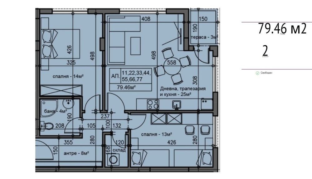 Светъл и просторен тристаен апартамент с отлична локация до бул. Сливница! Общата жилищна площ на апартамента е 79,46кв.м., като с прилежащите общи части тя достига 91,14кв.м. Апартаментът се намира на втори етаж.