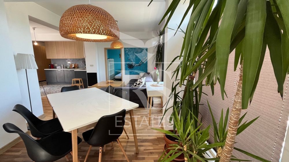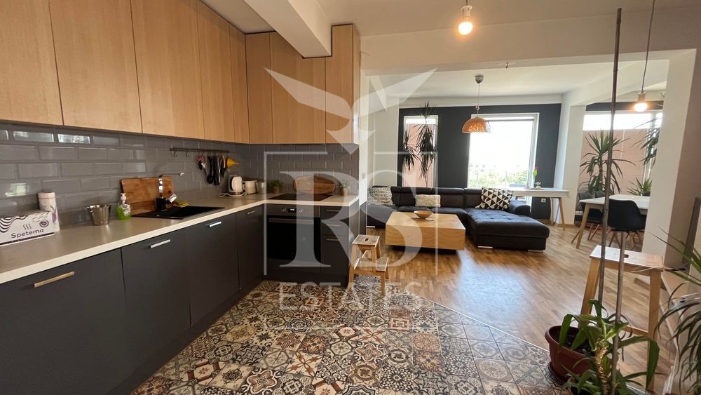 - просторна дневна с трапезария и кухненска част, обзаведени със стилни мебели и всичко необходимо за домакинството: телевизор, печка, пералня, миялна машина, кафемашина.