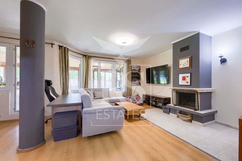 - Просторен хол с действаща камина, обединен с кухненски бокс и трапезария