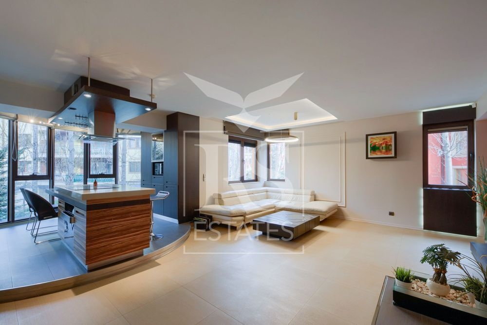 Просторен тристаен апартамент. Имотът е дизайнерски завършен и се намира в емблематичния комплекс Макси. Апартаментът е разположен на 1-и етаж от 5 , с изложения на изток и запад, с обща площ от 142 кв.м. и чиста площ от 127кв.м.