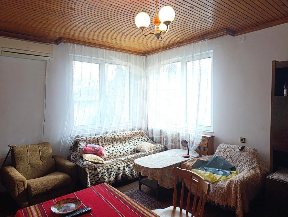Отоплението е решено с пелетна система, като за допълнителен комфорт са монтирани и климатици. Имотът се предлага полуобзаведен и е поддържан в добро състояние, с направени подобрения – подменена алуминиева дограма, външна топлоизолация и ремонтиран покрив преди около 3 години.