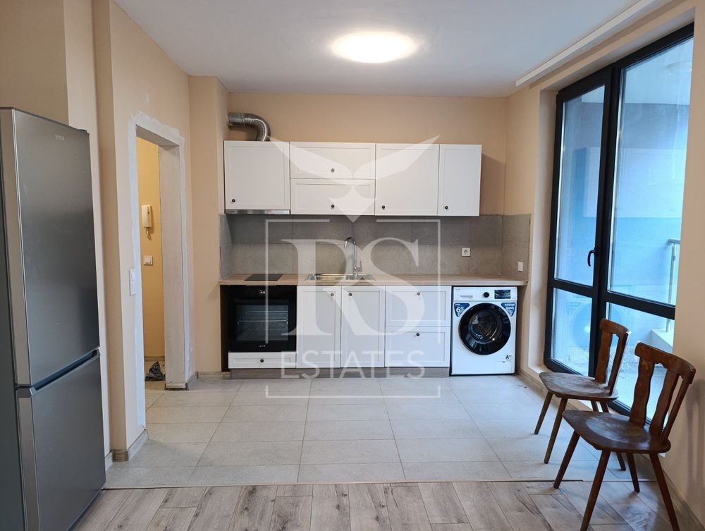 Двустаен апартамент с площ от 56 кв.м., разположен на първи жилищен етаж в нова тухлена сграда. Жилището се отдава частично обзаведено. Отоплението е на ТЕЦ-но няма радиатори, като има изводи за поставяне на климатици при необходимост.