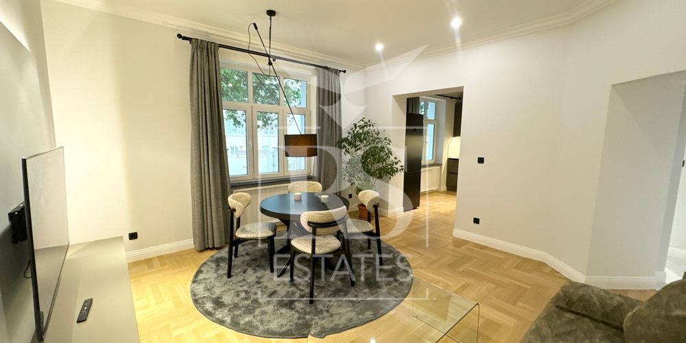 Жилището е разположено на първи партерен етаж в отлично поддържана сграда - архитектурен паметник, с малко на брой апартаменти. Реставрирана и обновена фасада и общи части, контрол на достъпа, тих и поддържан вътрешен двор.