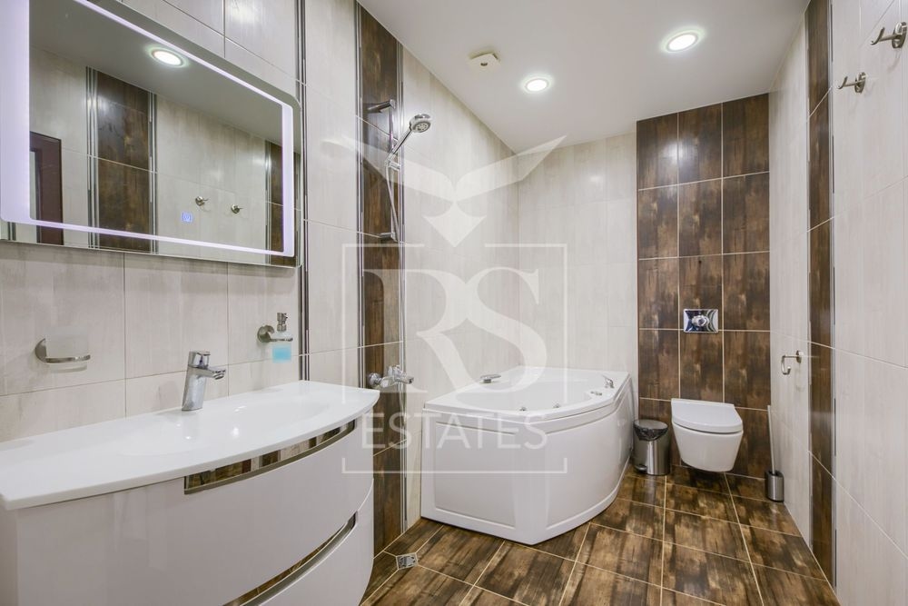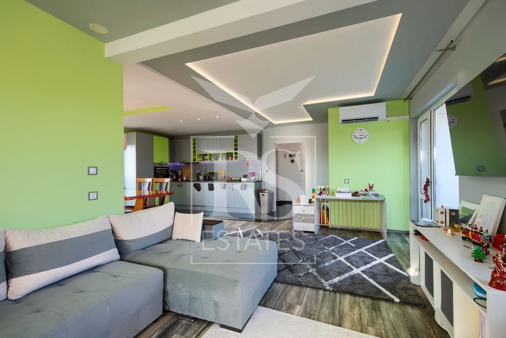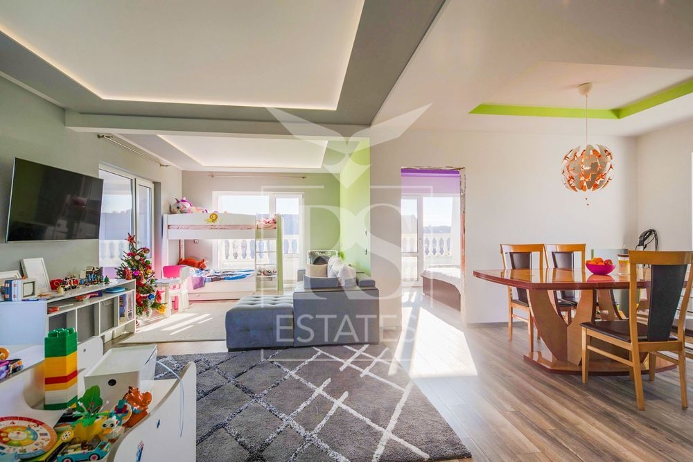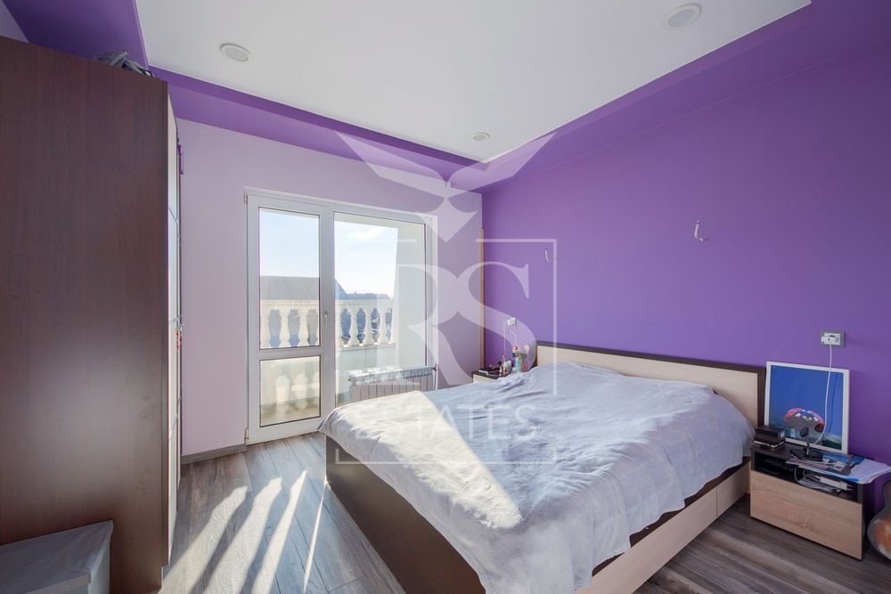 Вътрешни стълби отвеждат до антре, баня с тоалетна и хидро вана, кухня с трапезария и хол, спалня, три балкона. Дневната може да бъде преградена и там да се обособи втора спалня.