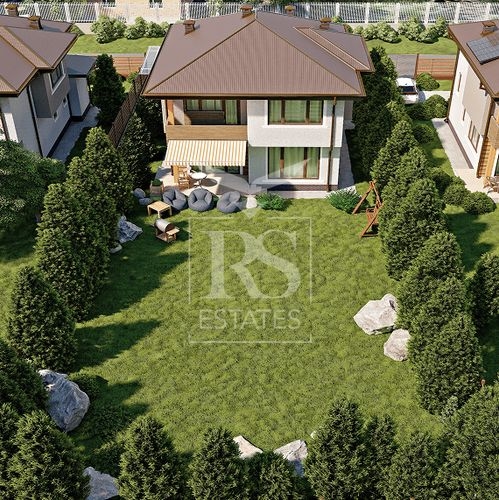 Двуетажна къща с площ 203 кв.м, част от малък комплекс от 7 самостоятелни къщи. Имотът е с модерна архитектура, газифициран, с височина на помещенията 3 м на първи етаж, и ще бъде завършен с висококачествени материали по БДС стандарт. Очаквано начало на строеж октомври 2025 и въвеждане в експлоатация (Акт 16) - лятото на 2026 година.