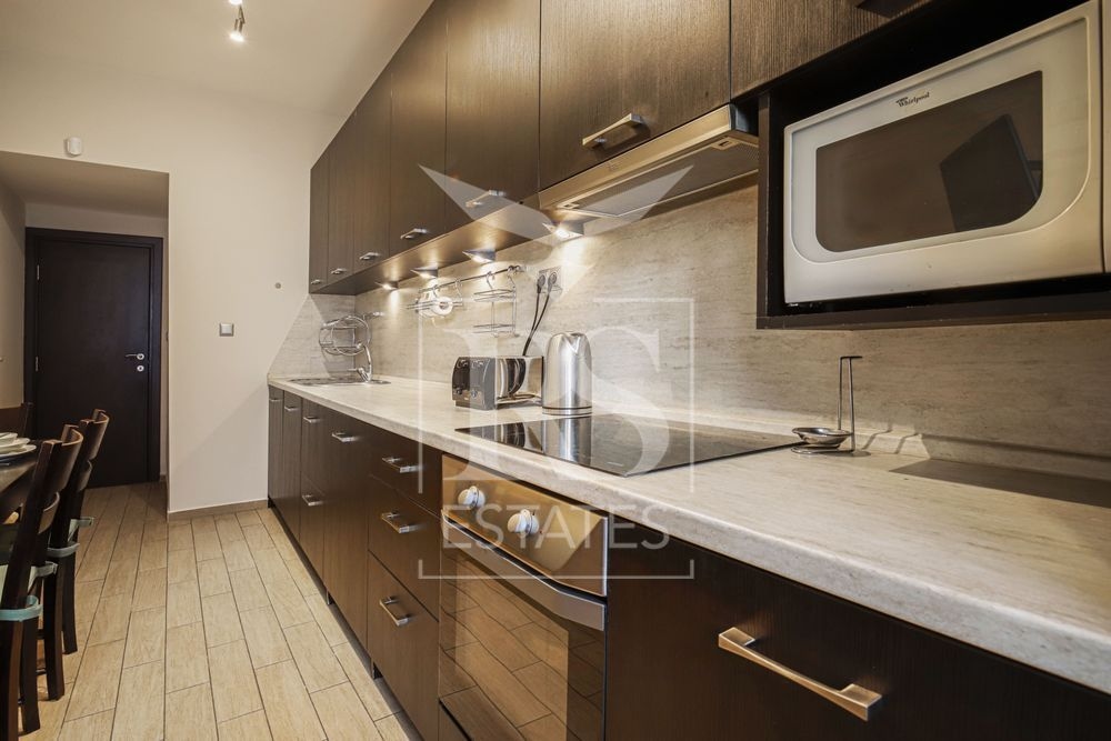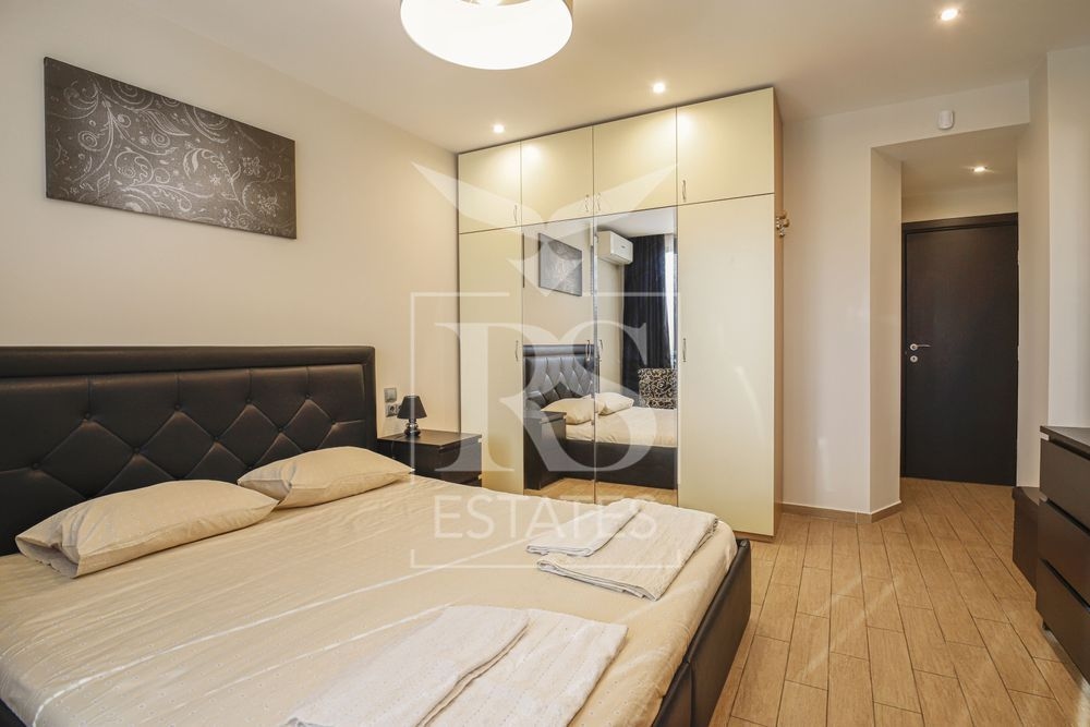 Жилището е с площ от 95 кв. м. и се състои от 2 спални, хол-всекидневна с трапезария, отделна самостоятелна голяма кухня, баня с тоалетна и широко антре. Всекидневната е просторна, с обособена част за хранене с маса с 6 стола, скрин, телевизор, и удобен ъгъл с мека мебел; терасата е с гледка към НДК. Родителската спалня е голяма, с двойно легло, с два големи гардероба, огледало и скрин. Малката спалня в момента се използва като кабинет, но в нея по желание може да се постави двойно легло, в спалнята има също и гардероб. Кухнята е оборудвана с всички необходими ел. уреди - съдомиялна, пералня, микровълнова печка, хладилник, фурна, абсорбатор, модерна кафе машина с капсули, тостер, термокана, тигани, тенджери, чинии, чаши, посуда. Банята е с тоалетна, с монтиран допълнително голям бойлер за използване при профилактични сезонни дейности на Топлофикация. Във всяко помещение има телевизор, в апартамента има и 3 климатика. Има завеси блекаут в спалните, тъмни в хола, и допълнителни щори на юг срещу силно слънце.