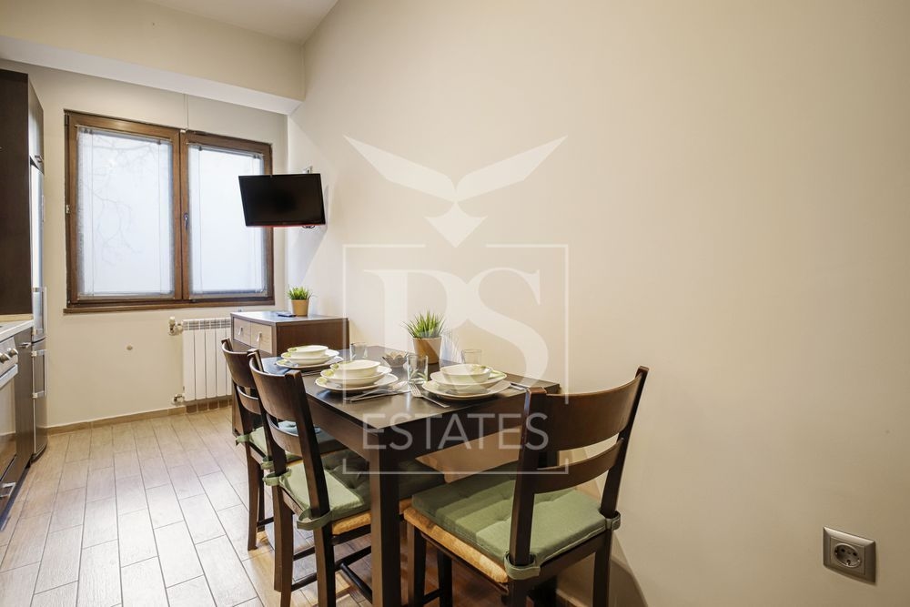 Чудесно обзаведен просторен и слънчев тристаен апартамент с две спални и отделна голяма кухня в представителна сграда в центъра на София. Жилището се намира на трети етаж в сграда, която е с образцово поддържани и чисти общи части, с функциониращ асансьор, с контрол на достъпа с чип на входната врата, с видеонаблюдение на входа и на етажа, видеодомофон и монтирана СОТ система в апартамента със солидна метална входна врата.