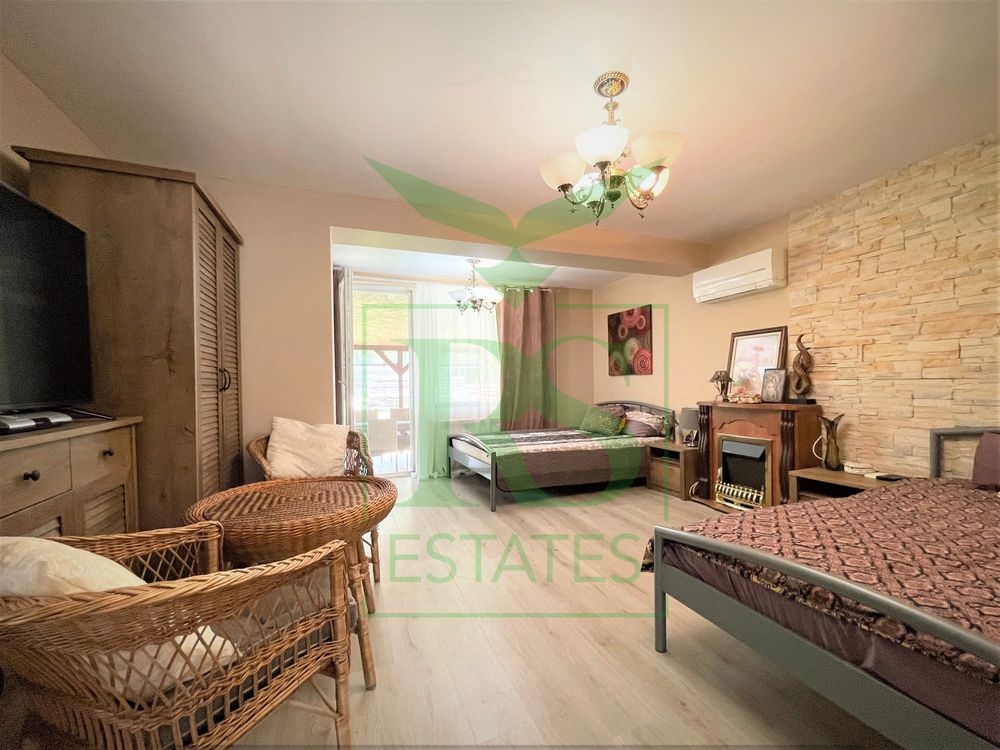 Къщата е довършена и обзаведена в стил „ Рустик” с естествени, масивни материали, камък дърво и текстил. Кухненската част е изпълнена с масивни поръчкови шафове от естествен фурнир и механизми за плавно прибиране “Blumi” , вградените уреди са на марка Gorenje.
