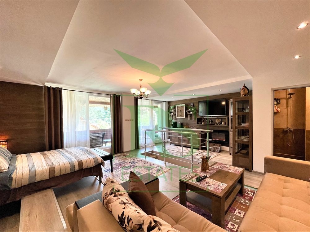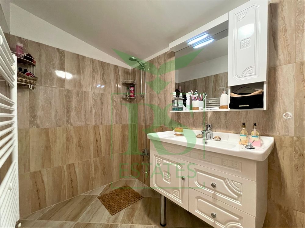 3. Етаж основна спалня на целия етаж, с мека мебел, самостоятелна баня с тоалетна, вградени гардероби и излаз към голяма Г-образна веранда.