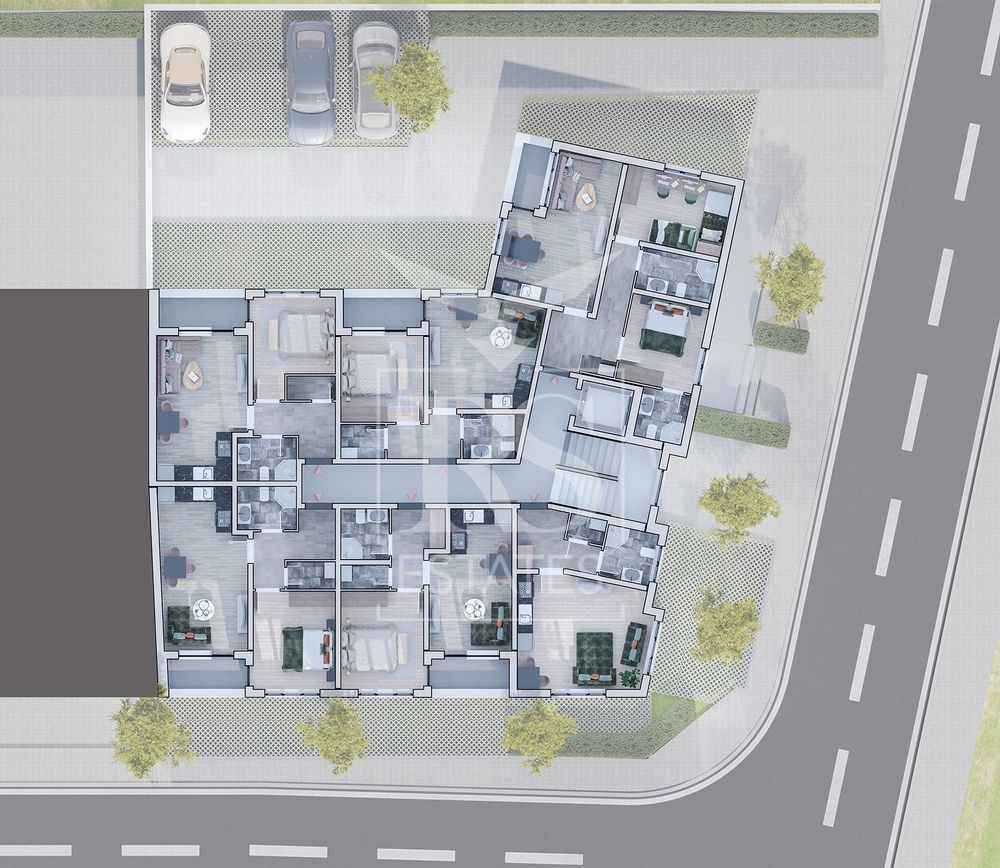 - апартаментите се предават по БДС: турбозол по стени и тавани, циментова замазка по пода, блиндирана входна врата, ПВЦ дограма със стъклопакет, изводи за електро и слаботокови инсталации, водопровод и канализация до тапа;